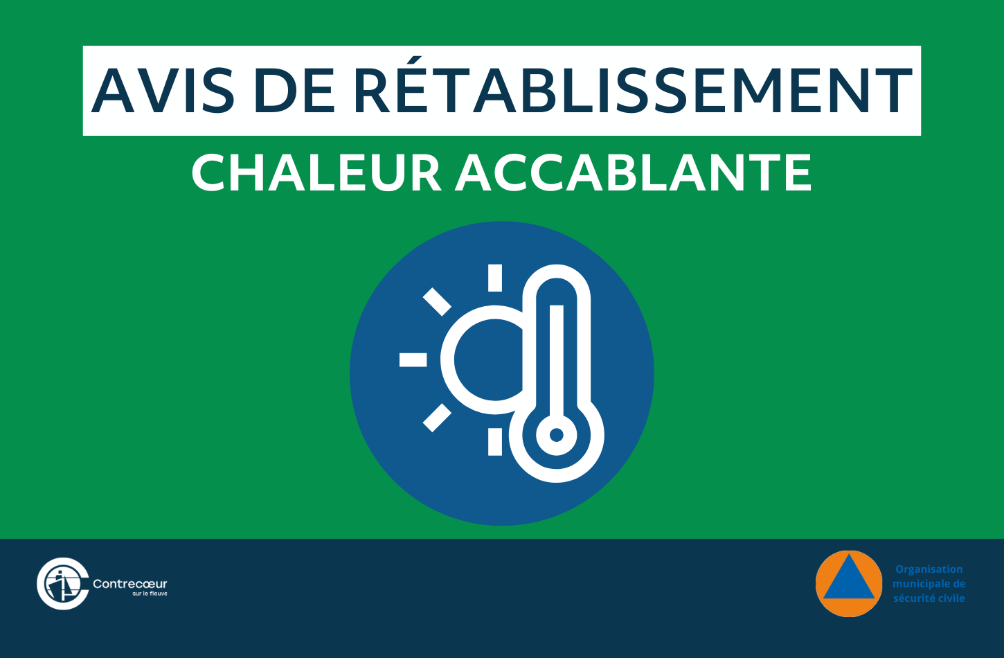 L’Organisation municipale de sécurité civile (OMSC) de la Ville de Contrecœur passe au niveau « Rétablissement » de son plan de sécurité civile municipal pour un événement de chaleur extrême sur son territoire.