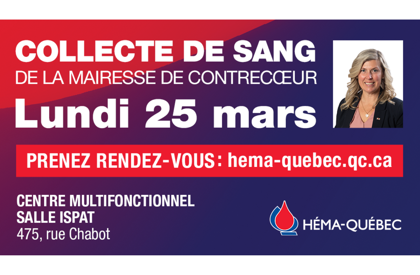 Afin d’atteindre cet objectif, la Ville de Contrecœur, en collaboration avec les Chevaliers de Colomb vous invitent à la collecte qui se tiendra le lundi 25 mars, de 13 h 30 à 19 h 30, au Centre Multifonctionnel (Salle Ispat) situé au 475, rue Chabot, Contrecœur. Pour cet évènement sous la présidence d’honneur de Mme Maud Allaire, mairesse de Contrecœur, nous visons à accueillir 60 donneurs.
