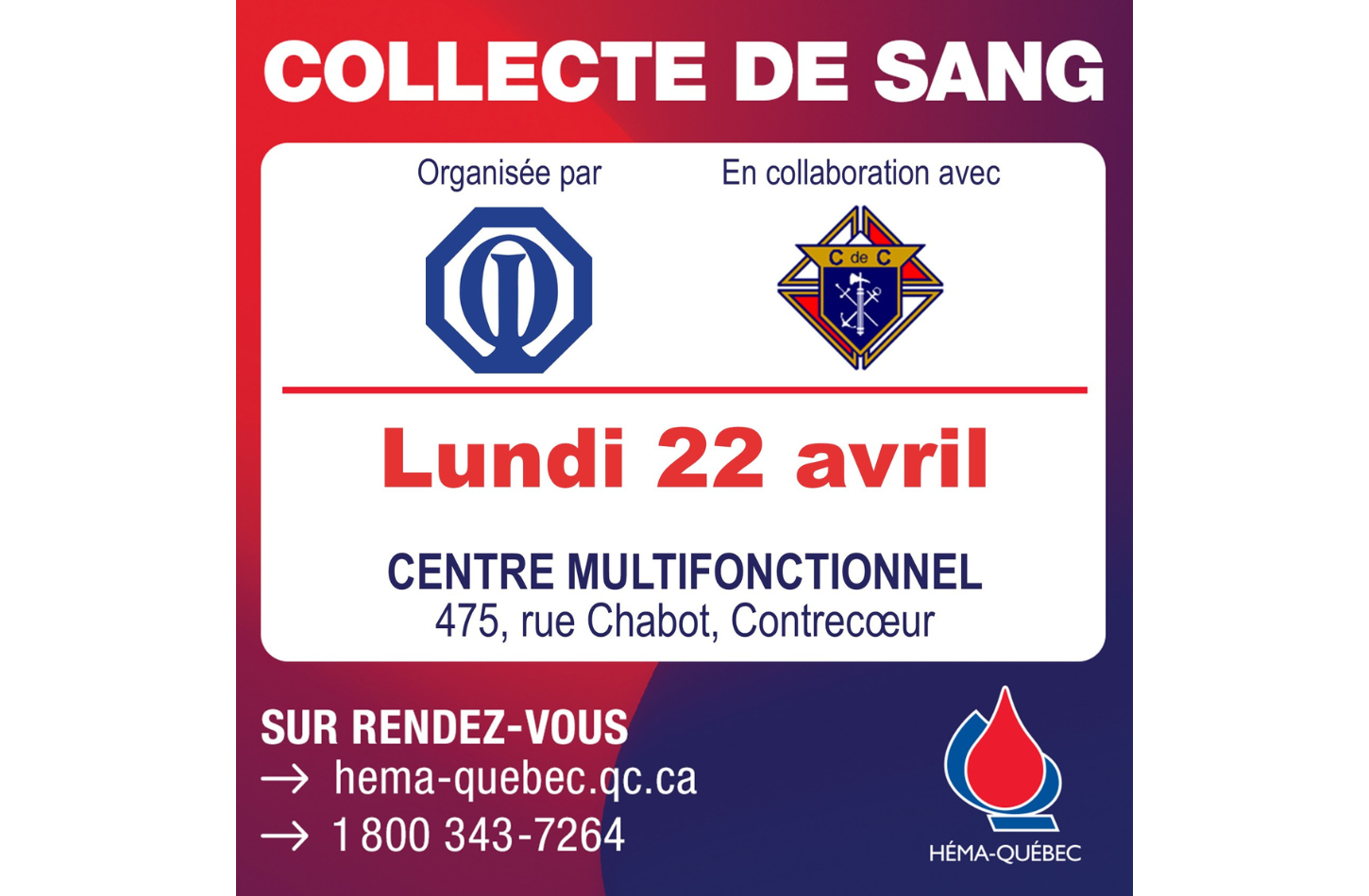 Afin d’atteindre cet objectif, le Club Optimiste, en collaboration avec Les Chevaliers de Colomb vous invitent à la collecte qui se tiendra le lundi 22 avril, de 13 h 30 à 19 h 30, au Centre Multifonctionnel situé au 475, rue Chabot, Contrecœur. Pour cet évènement, nous visons à accueillir 75 donneurs.