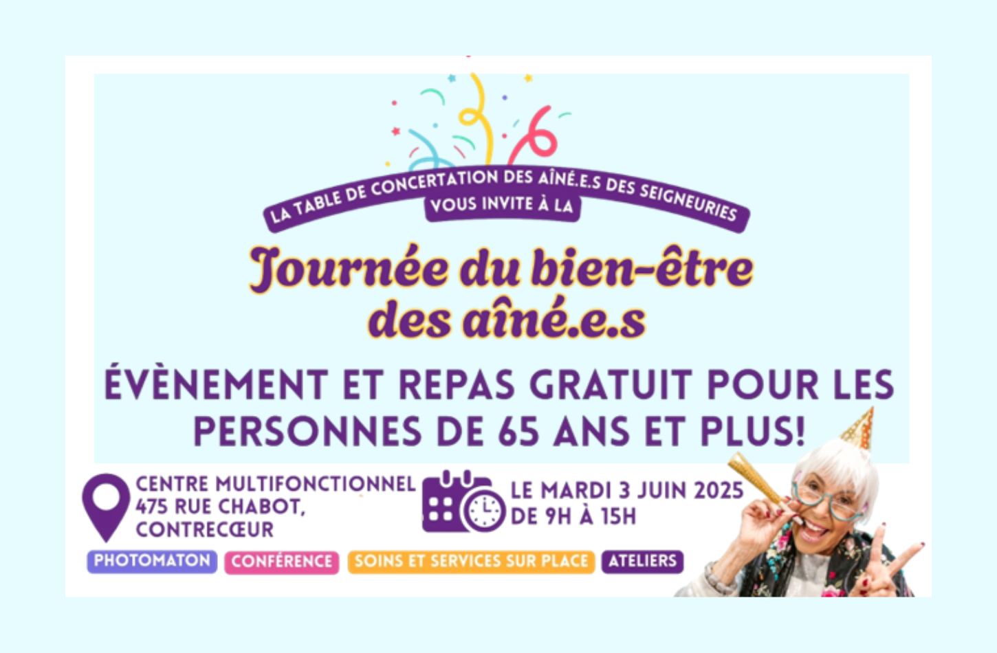 Durant cette journée, plusieurs activités et des ateliers axés sur le bien-être seront offerts ainsi qu'un dîner convivial. De plus, on vous invite à assister à une conférence enrichissante et de profiter d'un photomaton pour vous divertir. Il s’agit d’une occasion unique pour les aînés de se rassembler, d’échanger et de profiter d’une journée qui leur est entièrement consacrée.