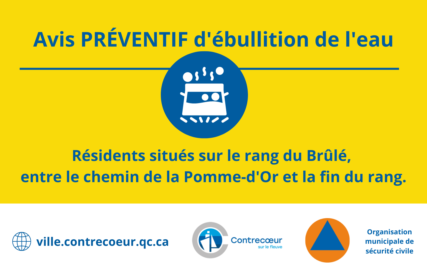 En raison d’un bris d’aqueduc qui est maintenant réparé, un avis d’ébullition d'eau préventif est en vigueur jusqu'à nouvel ordre pour les résidents situés sur le rang du Brûlé, entre le chemin de la Pomme-d'Or et la fin du rang.