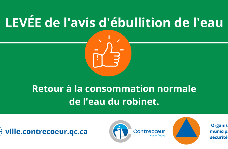 L’avis préventif d'ébullition de l’eau est levé pour les résidents de la route Marie-Victorin entre les numéros 6208 et 10350 (jusqu’aux limites de Sorel-Tracy) et des rues transversales dans le secteur déterminé.