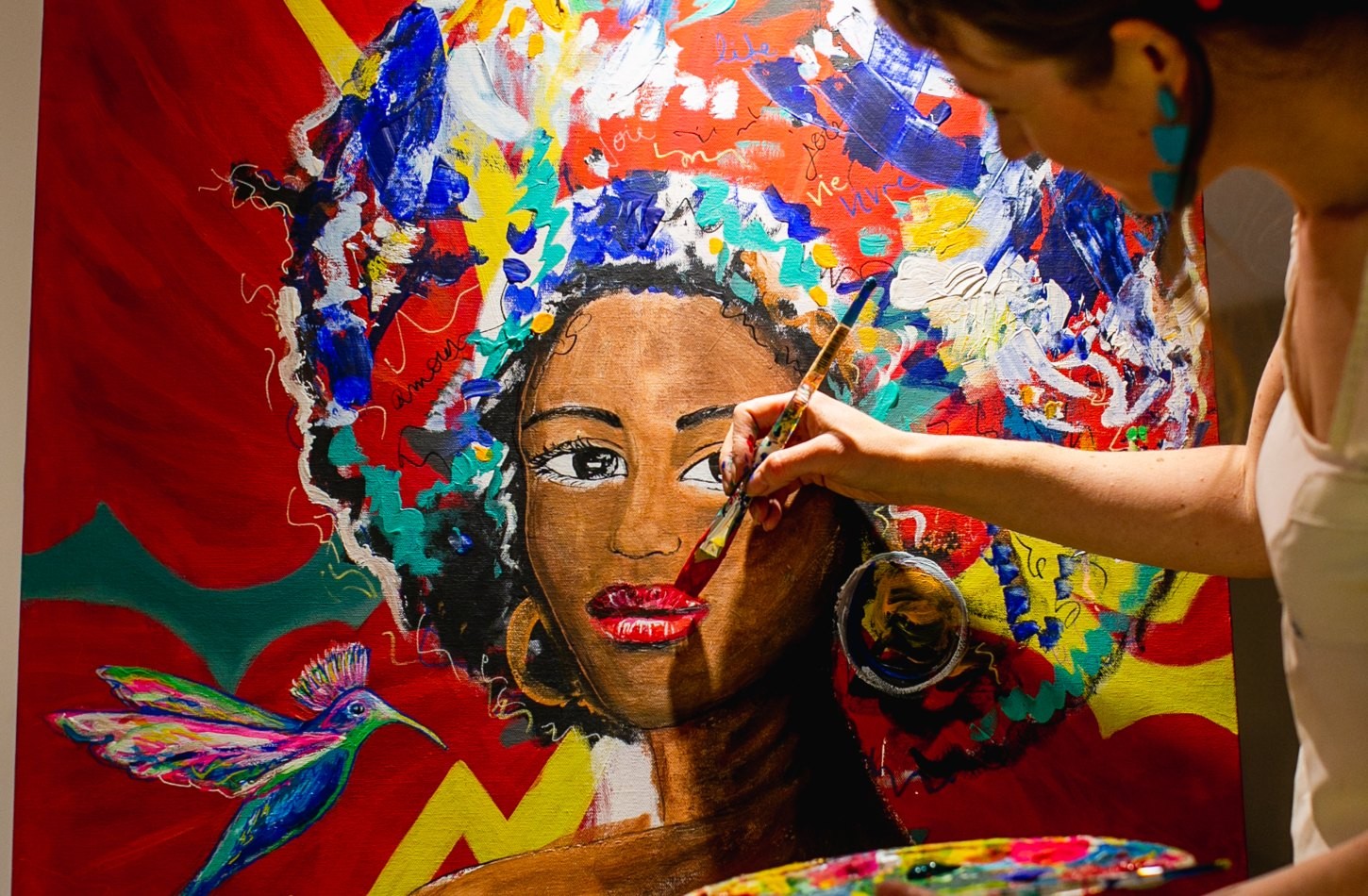 Tous les samedis et dimanches, de 10 h à 17 h, le public pourra découvrir les œuvres colorées et lumineuses qui font la belle part aux femmes issues des communautés culturelles. C’est que l’artiste, qui a habité 14 ans au Québec, a fait plusieurs voyages en Afrique et en Amérique latine ce qui l’inspire assurément dans ses créations. L’ensemble de ses peintures sur toile sont des toiles recyclées, déjà peintes, trouvées dans la rue ou chez les gens. Elle offre une seconde vie à ces objets voués à disparaître et laisse une trace de l’ancienne peinture visible en hommage à ce qui a été.
