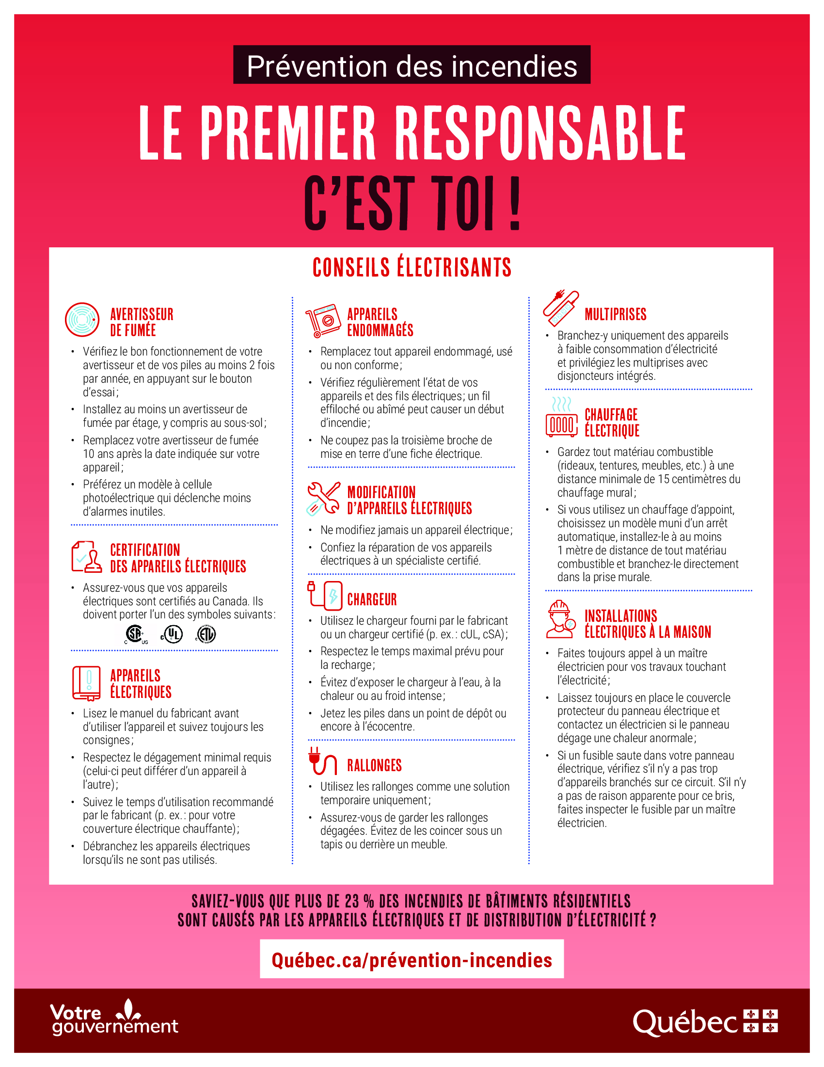 Pour encore plus de conseils sur la prévention des incendies d’origine électrique, consultez les conseils du gouvernement du Québec.
