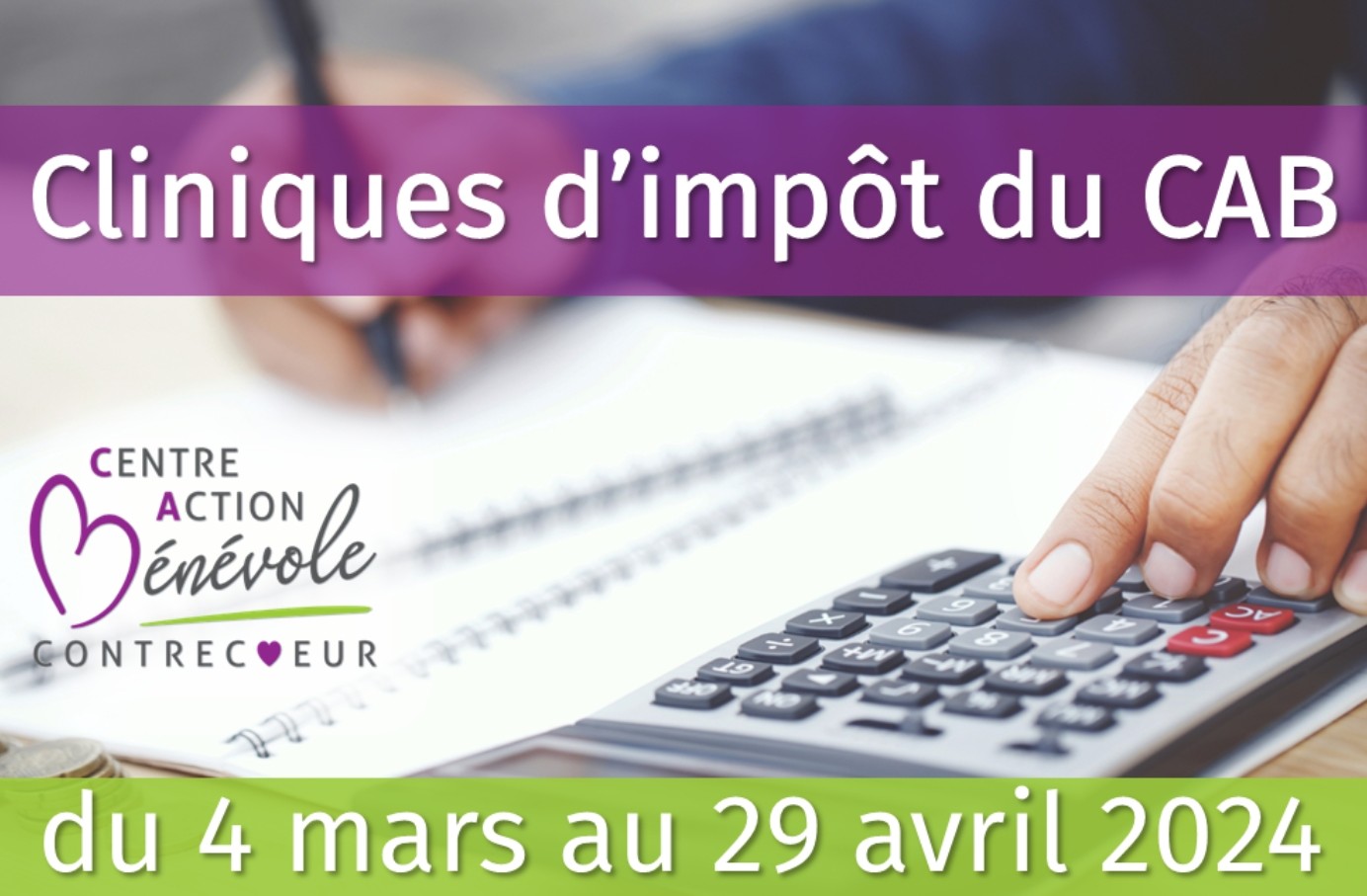 Contrecœur, lundi 26 février 2024 – Le Centre d’action bénévole (CAB) de Contrecœur désire annoncer l’ouverture prochaine de ses cliniques d’impôts s’adressant aux personnes à faible revenu de Contrecœur. Les cliniques débuteront dès le 4 mars prochain, sur rendez-vous seulement. Ces dernières auront lieu tous les lundis, mardis et jeudis matin de 9 h à midi, et ce, jusqu’au 29 avril.