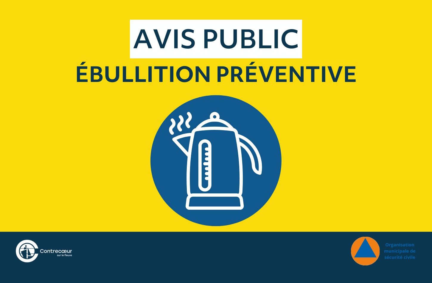 MISE À JOUR, mercredi 28 janvier 2026, 1 h 40 - La Ville de Contrecœur informe les résidences ciblées que l’ avis préventif d’ébullition de l’eau émis le 23 janvier est maintenant levé dans la zone suivante : Entre le 9254 et le 9300,......