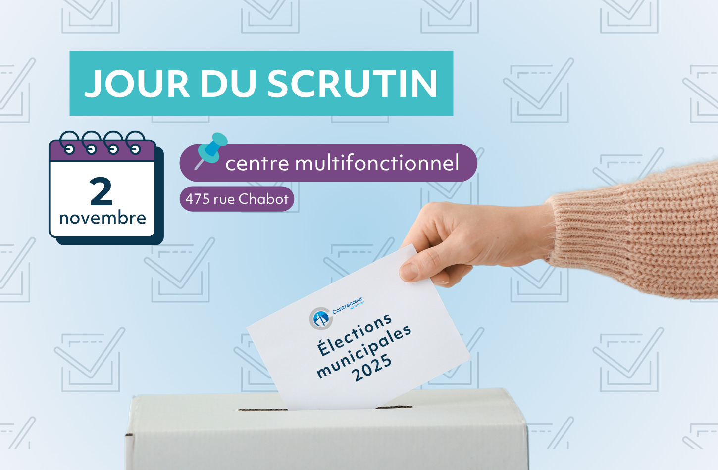 En savoir plusJour du scrutin à Contrecœur Date : 2 novembre 2025 Heure : de 10 h à 20 h Lieu : Centre multifonctionnel (475, rue Chabot) Suivre les résultats en direct À Contrecœur, les résultats du scrutin seront disponibles......